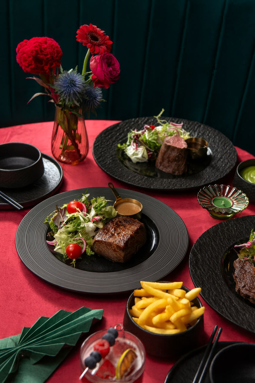 Z horké kuchyně servírujeme shaking beef z vyzrálého hovězího, kachní prso sous-vide a grilovanou chobotnici. Klasické techniky, moderní podání a vyvážené chutě.